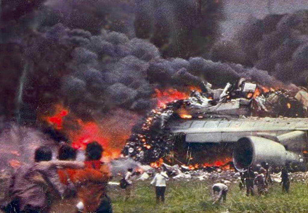 Dôsledky katastrofy na letisku Tenerife v roku 1977 po zrážke dvoch jumbo jetov 747 na dráhe. Letisko Los Rodeos, Tenerife, Kanárske ostrovy, popoludnie 27. marca 1977.