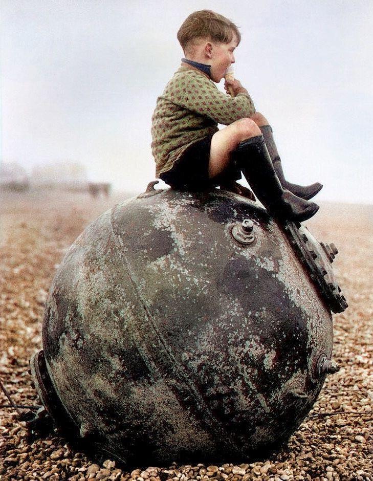 Toto je kolorizovaná fotka z roku 1940. Vidíme na nej evakuovaného Barrie Peacopa, ako sedí na námornej míne a je zmrzlinu. Mína sa vyplavila na pláž pri Deal v anglickom Kente.