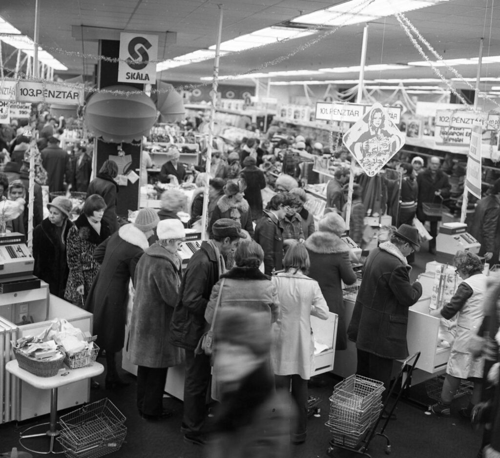 Otvorenie obchodného domu Skala v Budapešti v roku 1976. Obchod bol jedinečný tým, že bol družstevný a nie štátny. V deň otvorenia sa prišlo pozrieť 15 000 – 20 000 ľudí.