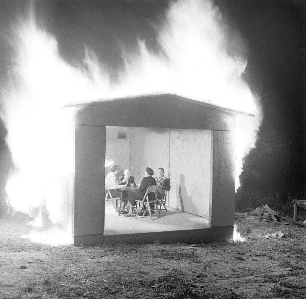 “Testovanie nového stavebného materiálu odolného voči požiarom.” – znel popis fotky. Zachytené v New Havene v roku 1949 Allanom Grantom pre časopis LIFE.