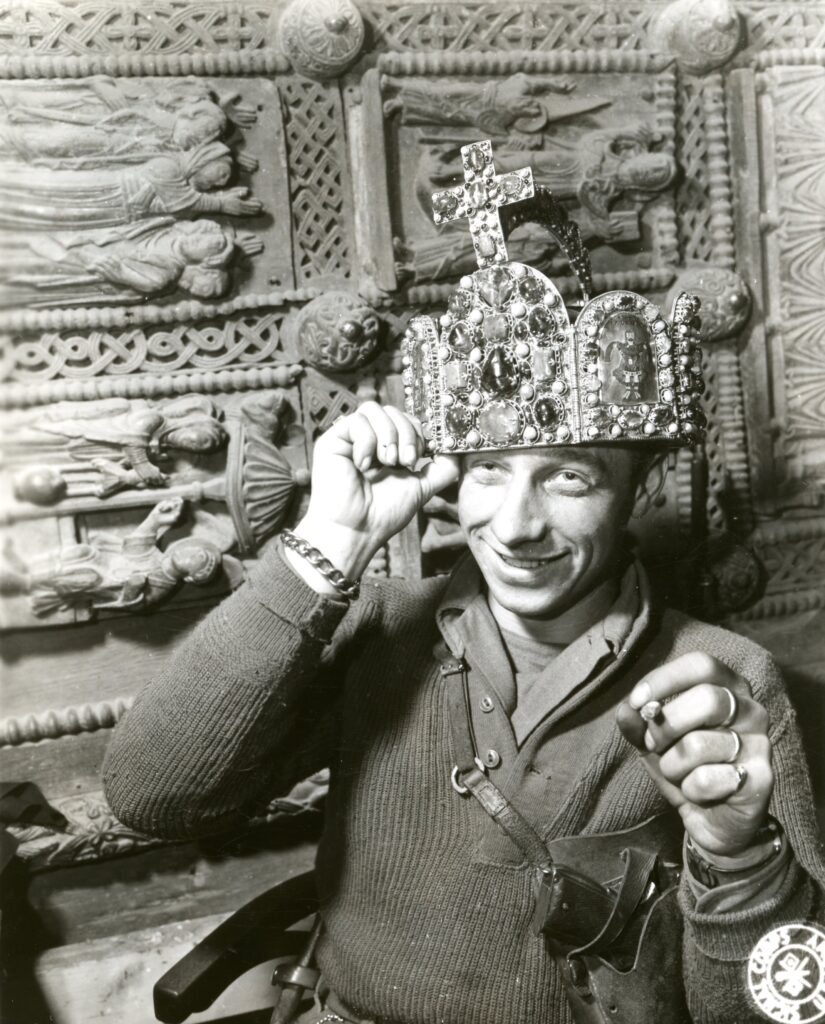 Ivan Babcock zo 165. signálnej fotografickej roty americkej armády pózuje s korunou Svätej rímskej ríše v jaskyni počas druhej svetovej vojny. Siegan, Nemecko. 3. apríla 1945.